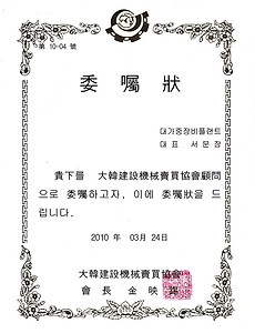 대한건설기계매매협회, 부회장, 선출, 대가중장비플랜트, 대표 서문장, 2010년3월24일, Elected vice chairman of the Korea Construction Equipment Trade Association. 20100324, Daeka Equipment and Plant, 대한건설기계매매협회, 부회장, 선출, 대가중장비플랜트, 대표 서문장, 2010년3월24일, Elected vice chairman of the Korea Construction Equipment Trade Association. 20100324, Daeka Equipment and Plant,